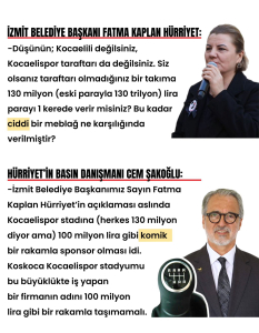 İzmit Belediye Başkanı Fatma Kaplan Hürriyet, bir gün önce Kocaelispor’un ana sponsorunu masaya yatırmış, “Düşünün; Kocaelili değilsiniz, Kocaelispor taraftarı da değilsiniz. Siz olsanız taraftarı olmadığınız bir takıma 130 milyon (eski parayla 130 trilyon) lira parayı 1 kerede verir misiniz? Bu kadar ciddi bir meblağ ne karşılığında verilmiştir?” demişti. Ligde başarı ivmesi yakalayan Yeşil-Siyahlı ekibi karıştırmaya yönelik olarak görülen bu açıklamaya Hürriyet’in partilileri bile tepki gösterirken, Basın Danışmanı Cem Şakoğlu’ndan bugün herkesi şaşırtan yeni bir açıklama geldi.
